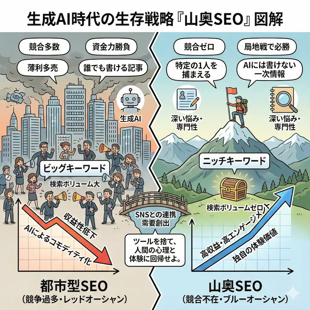 しかし、諦めるのはまだ早いです。私たちには「山奥SEO」という、誰も足を踏み入れない領域で戦うゲリラ戦術が残されています。